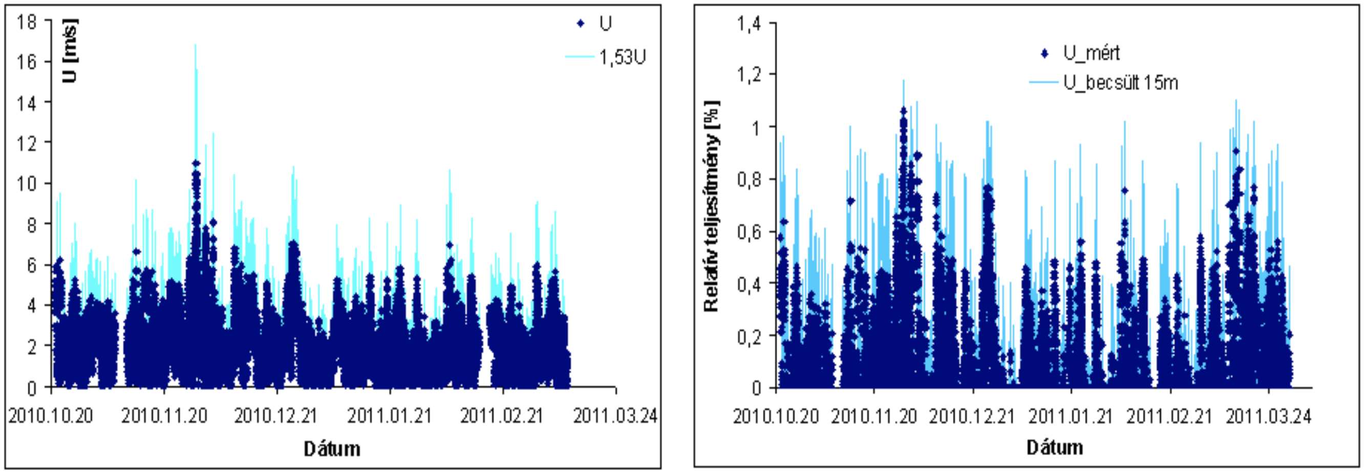 2. ábra. A budaörsi szélmérések és a 15 m-es szintre interpolált szélsebességi értékek és a belőlük számított relatív szélteljesítmény idősorok (2010. október – 2011. március).