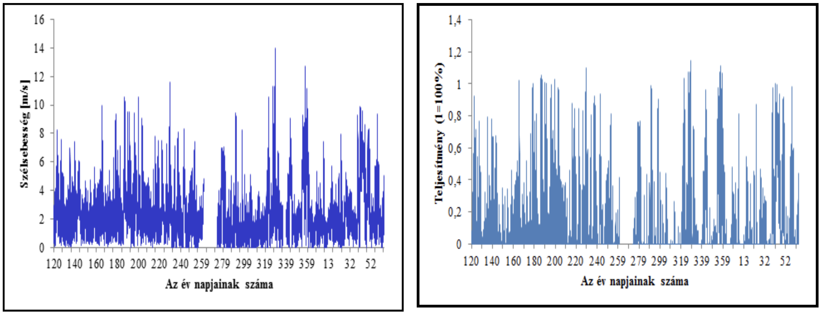 A számításokat a kínai gyártmányú Vk1–5 szélgenerátorra végeztük. A generátorból kijövő teljesítményt adtuk meg a gyári adatok alapján, ami azonban nem egyezik meg a tényleges teljesítménnyel. Megjegyezzük, hogy az elmúlt években az EU által támogatott kis szélgenerátor összehasonlító programban ez a generátortípus nem szerepelt (Wineur, 2007). A hitelesítési görbe „túl jónak” mutatkozott a Wineur (2007) programban szereplő generátorokhoz képest. Ez ismét arra figyelmeztet, hogy óvatosan kell eljárni a telepítés előkészítésével, a szélgépek kiválasztásával. Már itt megjegyezzük, hogy dacára a kiváló teljesítmény görbének, egyik helyen sem ajánlottuk a telepítést, nem teljesültek a beruházás megtérülésének a feltételei.
