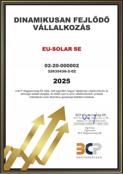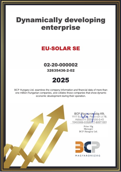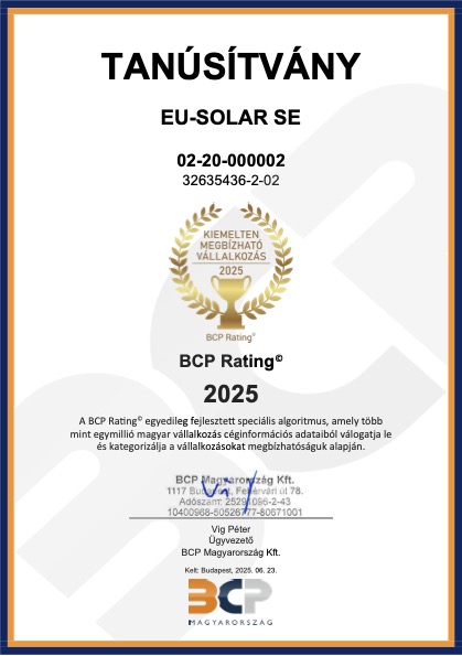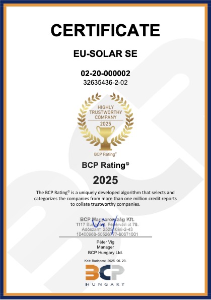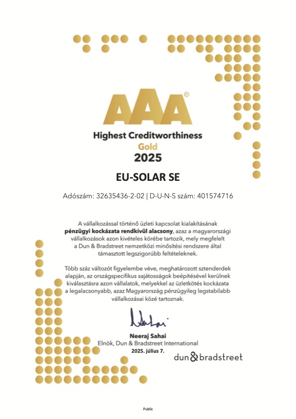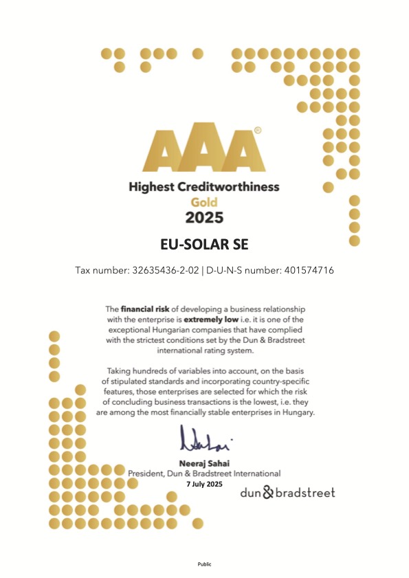 Az EU-SOLAR SE továbbá “Bisnode AAA Gold” minőstéssel rendelkezik, ami nem csak a napelemes piacon, de az egész magyar piacon kiemelkedő hitelképességet és megbízhatóságot garantál.