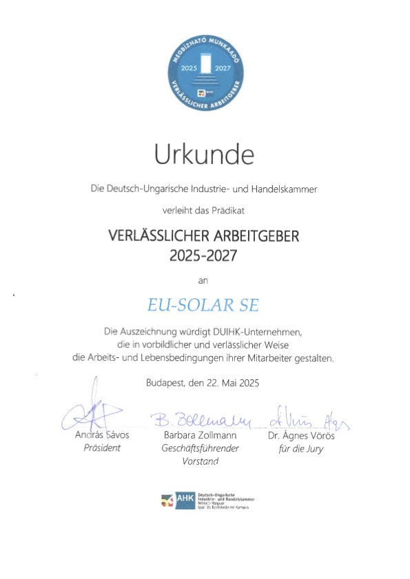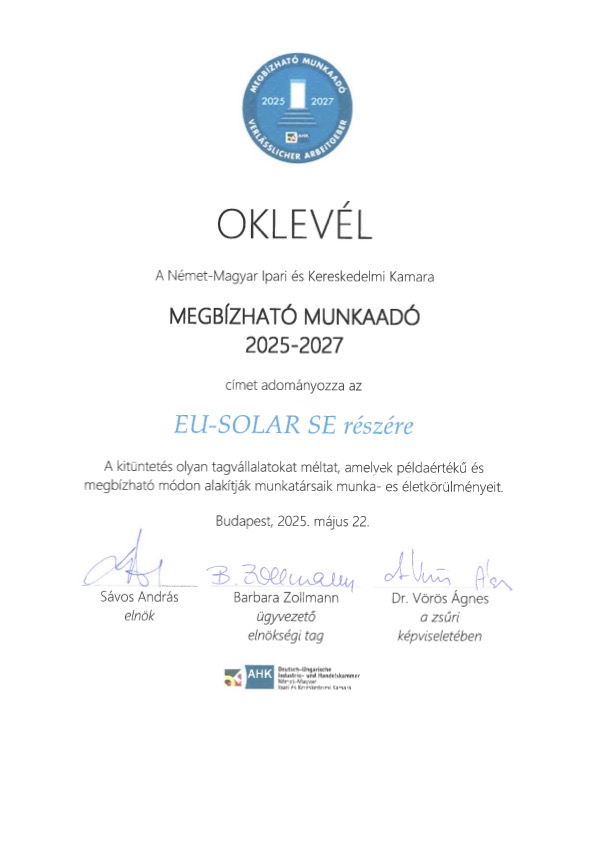 Az EU-SOLAR SE továbbá “Bisnode AAA Gold” minőstéssel rendelkezik, ami nem csak a napelemes piacon, de az egész magyar piacon kiemelkedő hitelképességet és megbízhatóságot garantál.